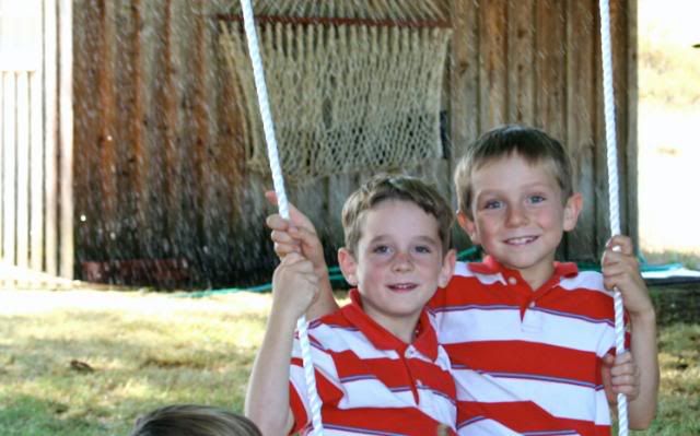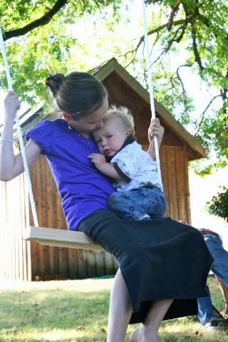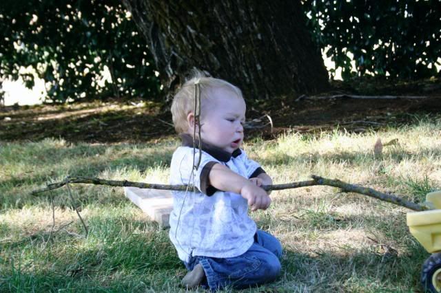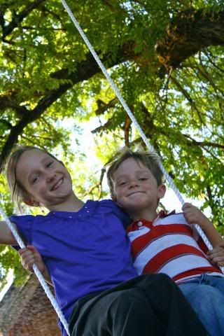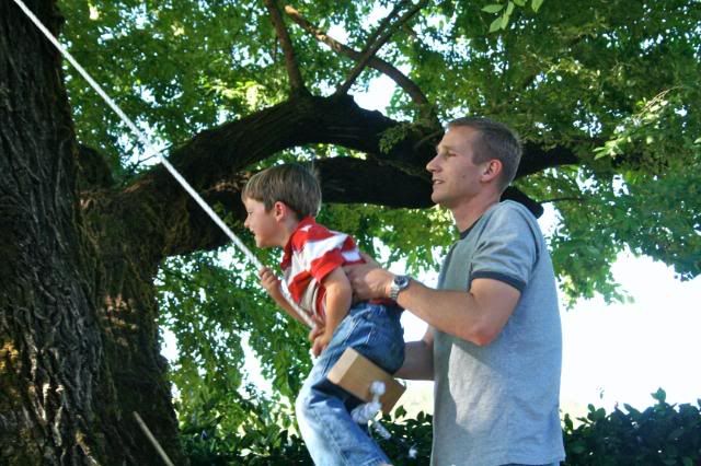This last weekend Eric hung some swings in the tree on the side of our house. As soon as I saw this tree when we first looked at this house, I could see all our children climbing all over this huge tree. It is the perfect tree for a tree house and a swing. The boys are currently working on the tree house part. They are all on the hunt for wood. Eric left behind all his “scrap”wood in this move, and all the “scrap” wood laying around the property are actually markers, or posts from the surveying. So needless to say, they think they desperately need wood. Michael suggested to their great uncle that he should go to the store and buy him some wood. Uncle Bob thought this was a good idea, or so I’m told by Michael. But they never got to the store. So this morning, the neighbor boy, came down to play for a while. His dad is a construction worker. BINGO!!!! Wood, nails,…. everything they needed for a tree house. I’m not sure if our friend asked his dad or not, but there is now plenty of wood and nails in the tree. And all the boys are happy! Swings and a tree house, life just doesn’t get any better!