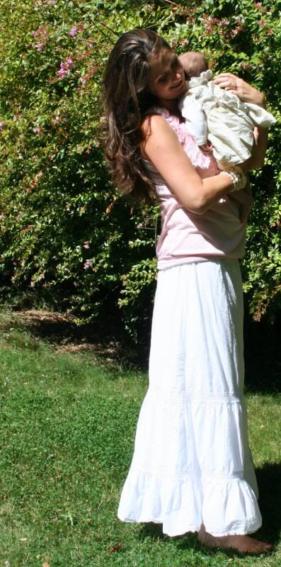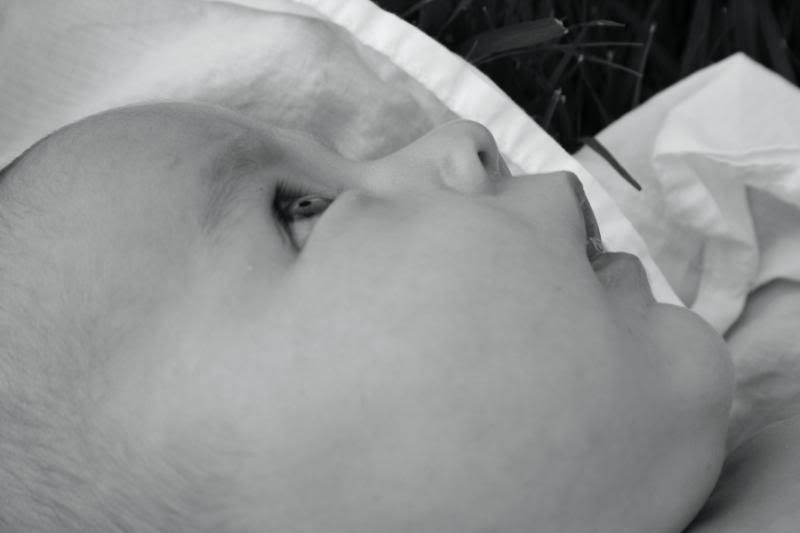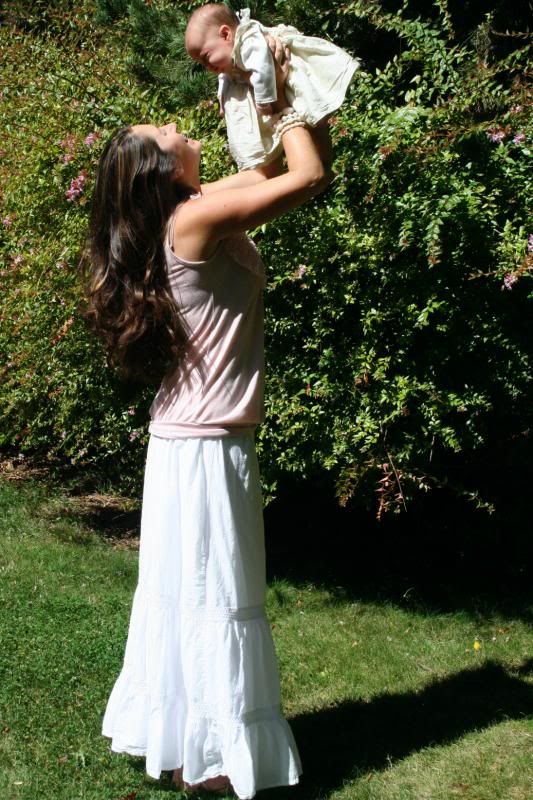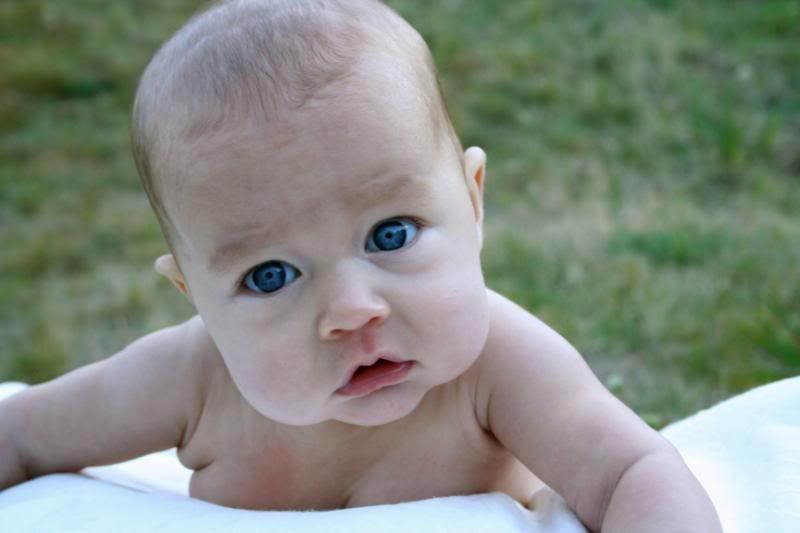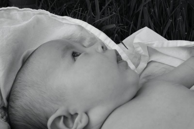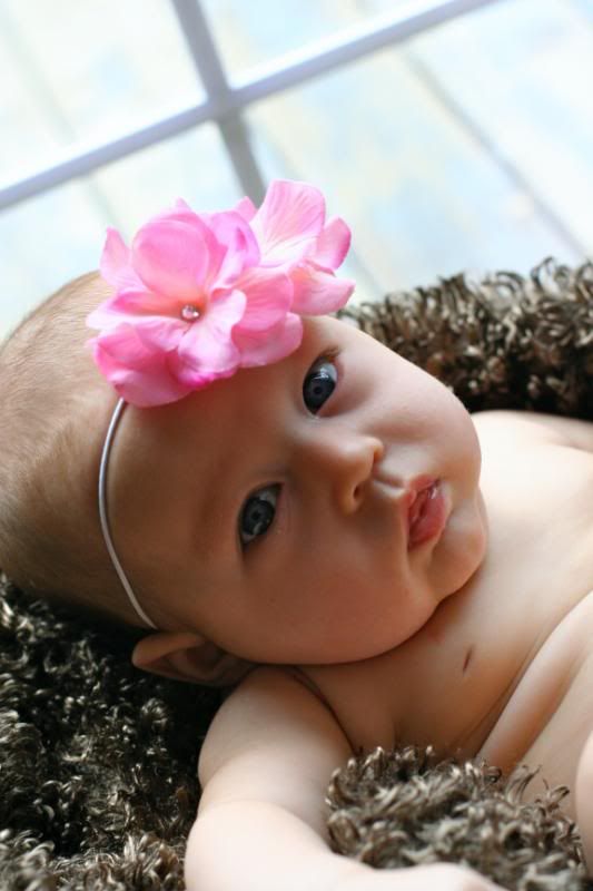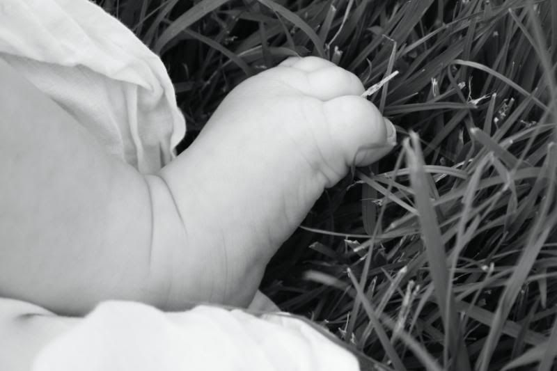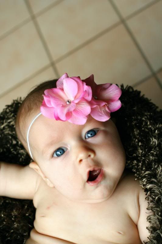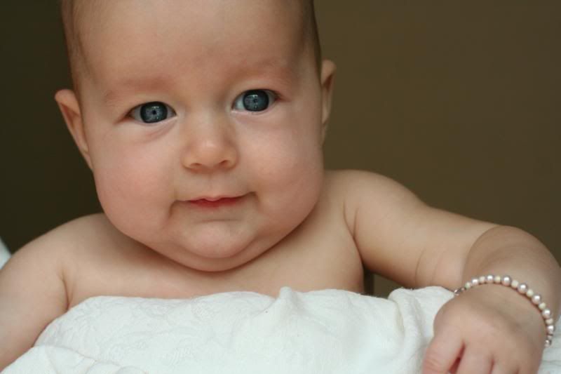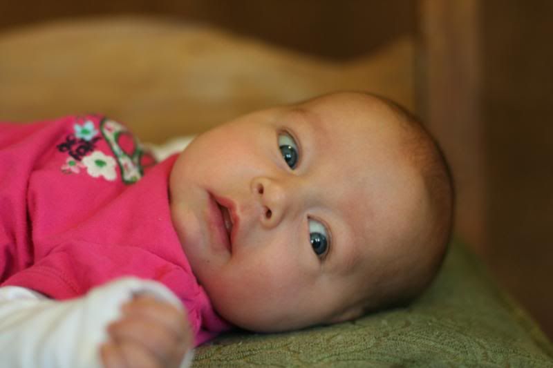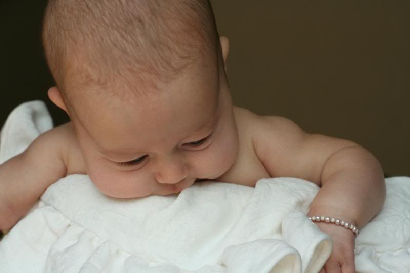 She is so alert these days. She loves to watch the action around her. Adn there is always action going on around here. She loves being outside and let the puppy smell her and lick her. But her absolute favorite thing to do is take a bath. Every night before I put her to bed, after the other children are all down, I put her in her little bathtub, and watch her play. She kicks and splashes. Giggles and smiles. And we play and play and play. It is so much fun to have a special time with her. just her and me. We play till she gets tired and then after lotion and jammies, we snuggle and rock until she falls asleep.