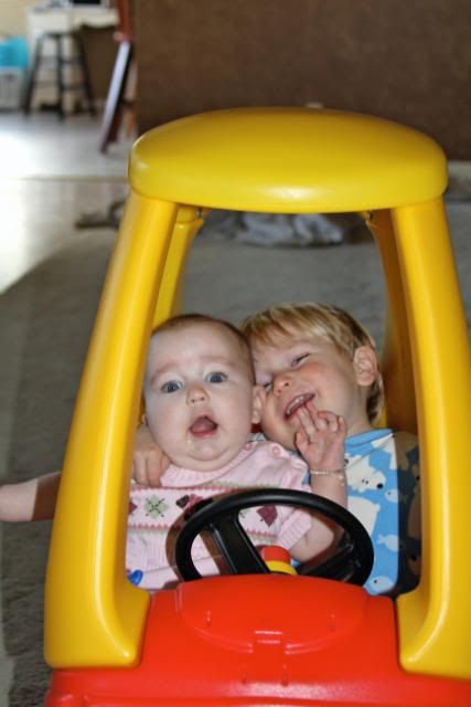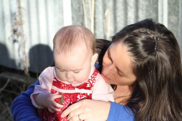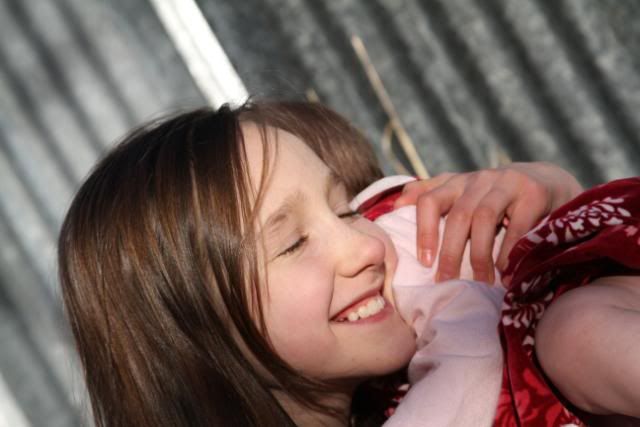 This last weekend we worked hard outside in our yard. Planting all those thousands of bulbs that I bought last fall. Digging big holes and planting fruit trees in our orchard. I think the children picked apple, pear, plum, peach, cherry and asian pear trees. The boys hauled firewood from trees that Eric had fell. I learned how to drive a tractor. We tore out some old pipes and put in new ones down by the creek. All the children were out there with us. The sun was shining and it felt warm, especially with all the work we were doing. Even little Julia joined us. I put her in the stroller and parked her on top of the hill by the chickens. She could watch them or watch us in the orchard. She loved it.