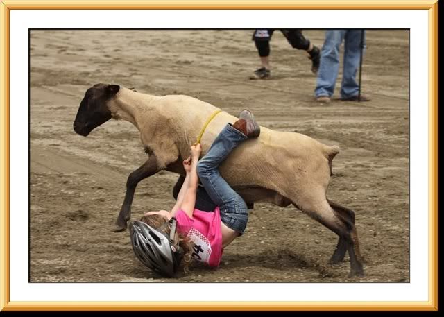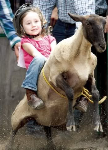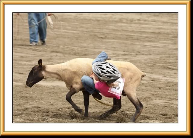 I immediately began to question my sanity as they put her on the sheep. I think it was right about then that I heard the Announcer over the loud speaker making a joke about how Mutton Bustin was the only legal form of child abuse in America. And I wanted to grab her off that sheep and run far away very fast. But in that split second, the sheep she was on tore out of the shoot, and she was off! She hung on for dear life. And would not let go….even after she lost her balance and the sheep (still running) drug her though the Arena. Finally, as the sheep neared the flock of other sheep on the far side of the arena, she let go. I was already running towards her, knowing that any second she would be screaming hysterically. But she never shed a tear. She got up, brushed up and announced to me and anybody else who was listening, “I want my belt buckle!” There was an eruption of cheering and clapping as we walked towards the gate. Cowboys were hanging over the fence, giving her high-fives as she strode out of that arena. But there was no belt buckle to claim. One little boy got very lucky, and his sheep decided to just walk around in a nice slow circle. And since the judging is done solely on time on the sheep, not how well you ride, the buckle went to him.